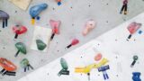 カラフルなホールドで壁を登る男性クライマー