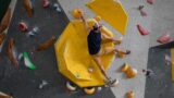 黄色のホールドで登る青い短パンの男性クライマー