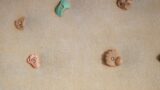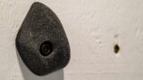 白い壁に取り付けられた黒いクライミングホールドのクローズアップ
