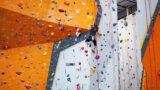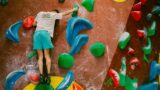 ボルダリングジムで多彩なホールドに挑戦する女性クライマー